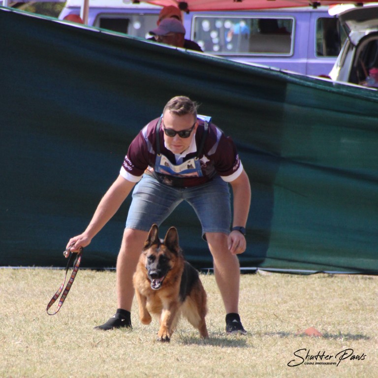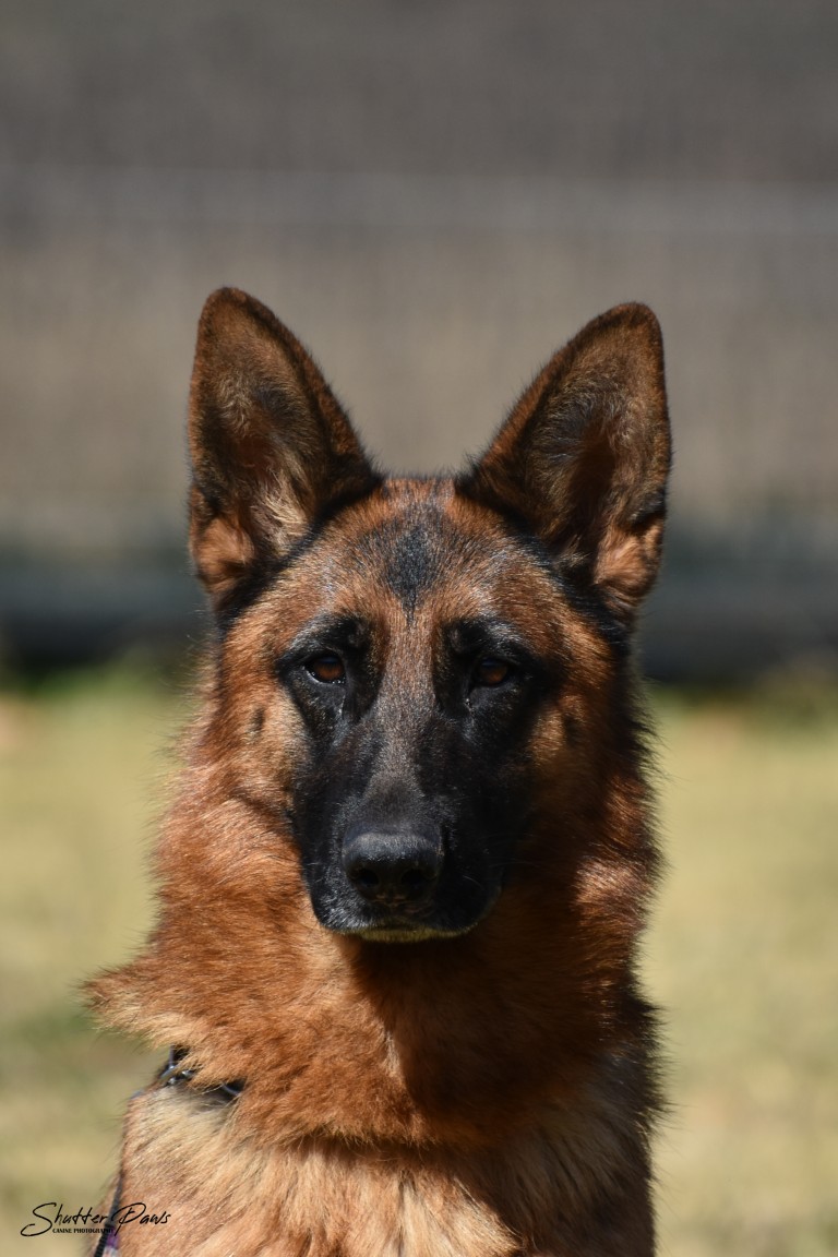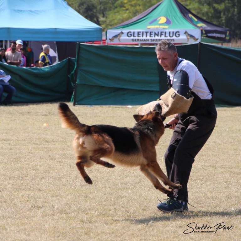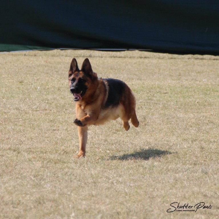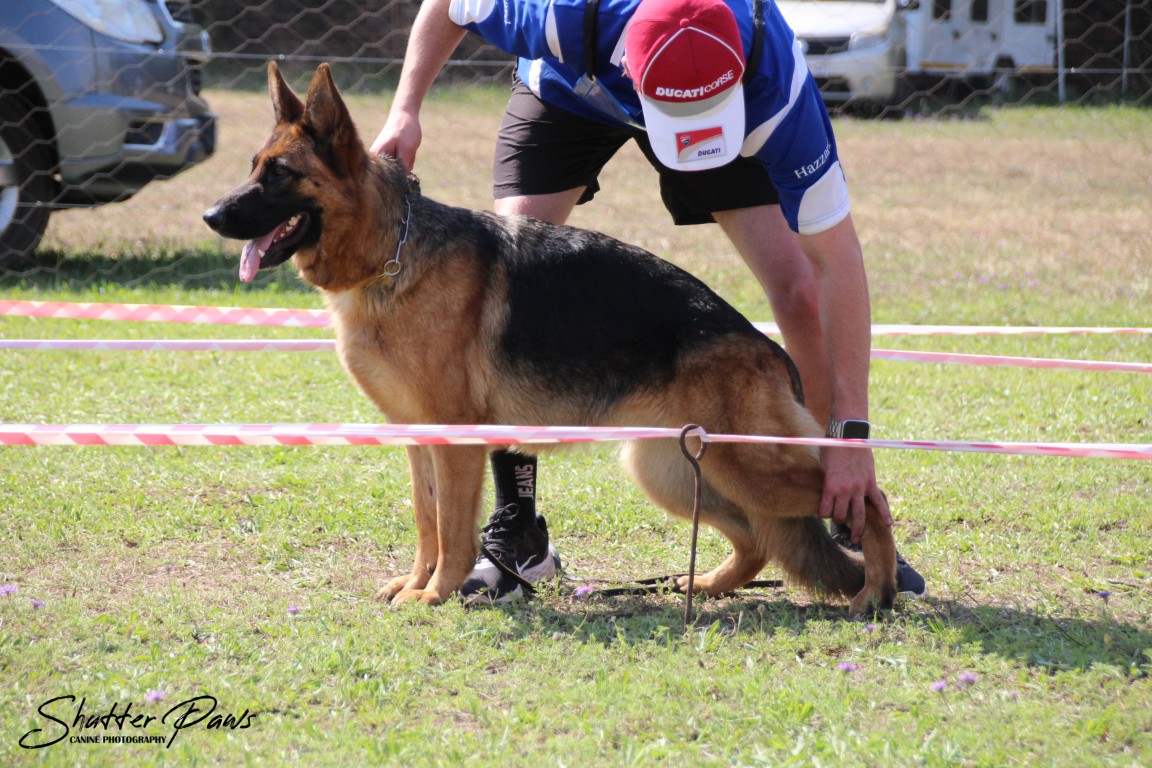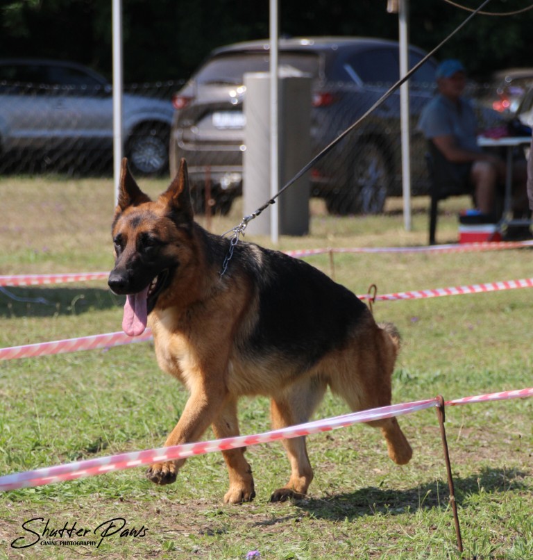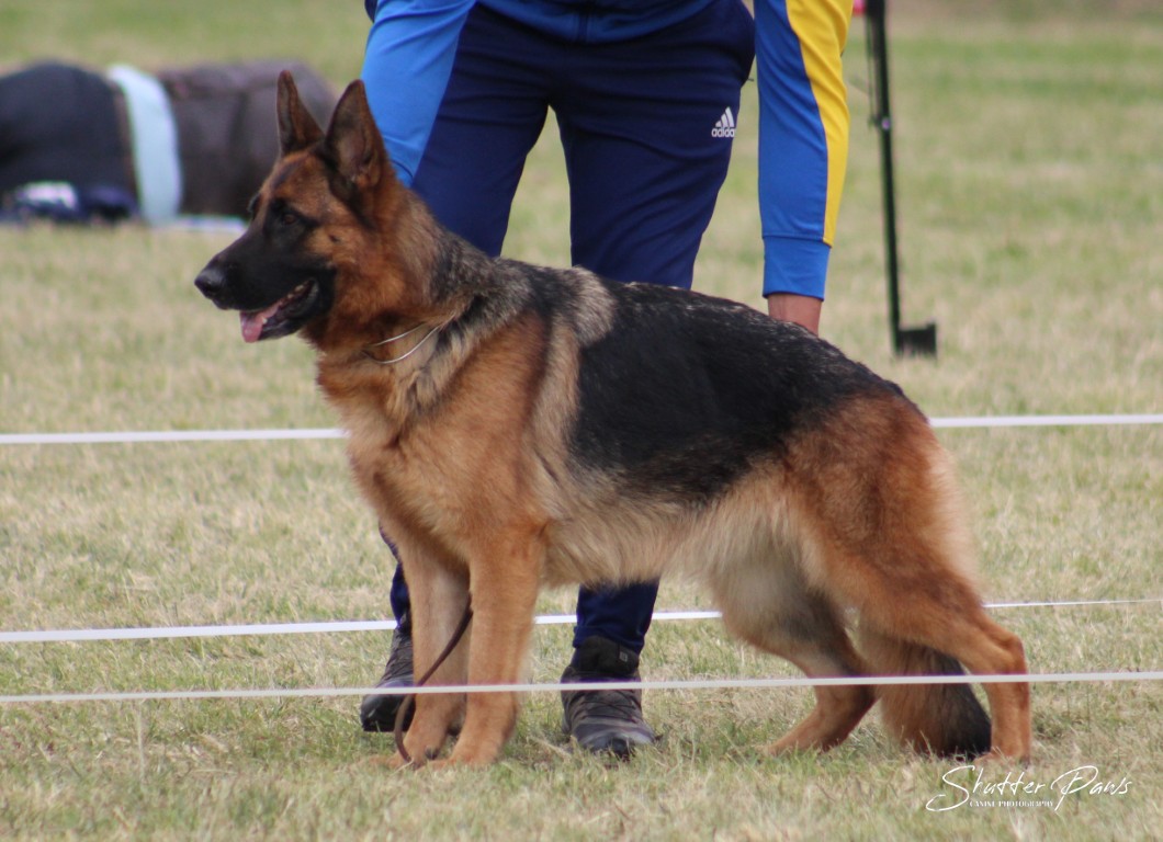 Upper medium size, medium strong with very good body proportions, very good pigmentation. Very good head and expression. High wither with a straight back. The croup is slightly short and slightly steep. Very good angulations. Correct in front. Correct going, narrow coming. Balanced ide gait with efficient hind thrust and very good forward reach. Drive, self assurance and stress tolerance (TSB) pronounced; dog does not release.