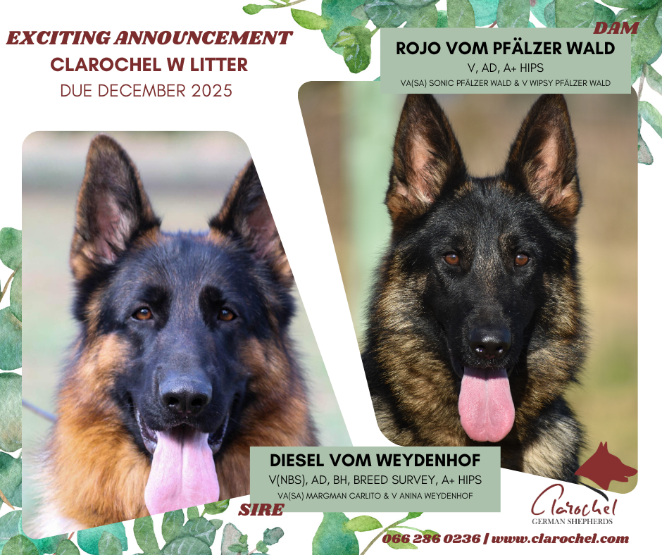 Clarochel German Shepherd Dogs is a small kennel, registered with the German Shepherd dog Federation of South Africa, where the wellbeing of our dogs matter more than an extensive breeding career. As a breeder focussed on quality over quantity, we do not permanently have puppies available. As a rule we only breed 2 or 3 litters a year.